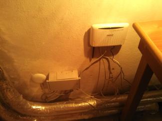 Of course, as you can see from the photograph, there is no building code. You just run wires across the walls and staple them to the outside of the building here. A bad as this looks, it is actually neater than the previous setup (I say, feeling guilty about incriminating myself with poor workmanship by putting up a photo that proves it).