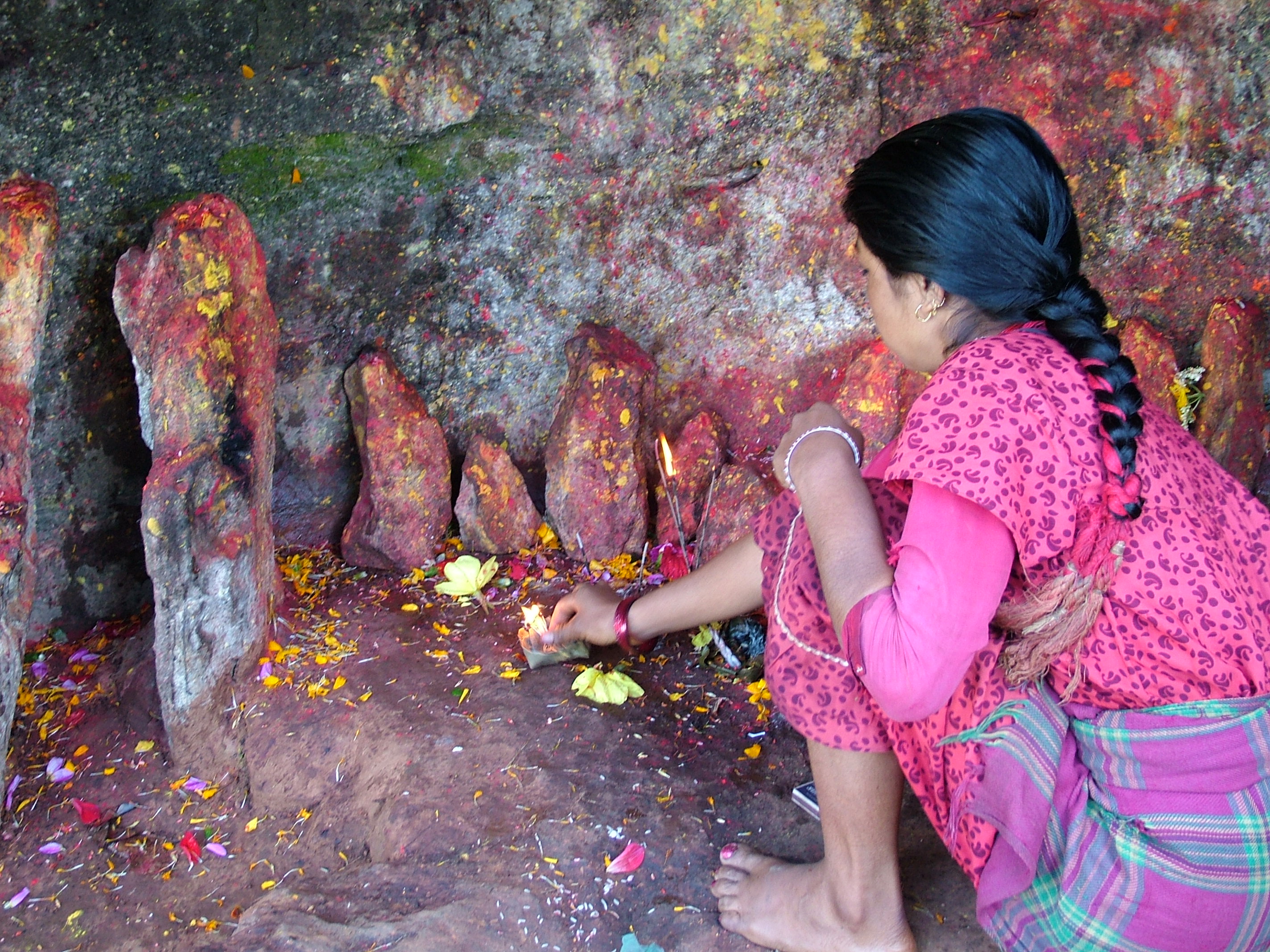 Two images of daily prayer in Nepal. The first one is Hindu. On a hillside above Lamatar, on the edge of the Kathmadu valley, there is a small cave that is known as a holy place. People honor it by lighting incense, placing flowers, and painting the rocks with red and yellow powder. There are also two bells that can be sounded at the end of prayer.