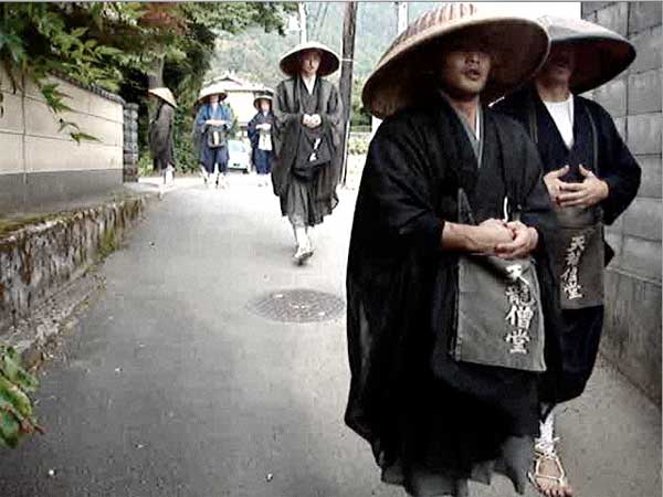 Takuhatsu, like everything in Rinsai Zen, is ritually codified. The monks wear traditional garb, including grass sandals, white leggings, a bamboo hat and a special begging bag. As you go you chant "Ho" in order to empty your mind, and it also just happens to announce your presense to people who might want to give. You stop at each house to give people in each house the opportunity to give.